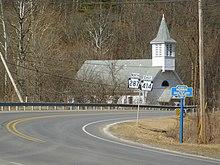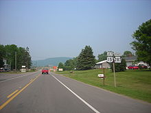Route 287 begins to parallel a waterway, entering the community of Antrim, which is surrounded mainly by forests. After Antrim, the highway continues northward through the deep forests for several miles, until entering the community of Knapp. In Knapp, Route 287 continues to the northeast, passing several fields and intersecting with a local road towards Broughton Hollow. At an intersection with Dean Hill Road, the highway turns to the northeast through the fields, entering Coolidge Hollows, a small farming community. At an intersection with Sweetbriar Road, Route 287 turns to the north, passing some homes before turning to the northeast into the farmlands once again. Approaching the intersection with Shumway Hill Road, the highway makes a gradual bend to the northwest, passing a large pond to the west, where it gains the name of Central Avenue as the route enters the community of Wellsboro.[24]