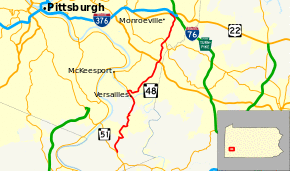 Pennsylvania Route 48 (PA 48) is an 18.9-mile-long (30.4 km) state highway located in the Pittsburgh, Pennsylvania area. The route is predominantly a two-lane highway as it runs through McKeesport and other suburbs. The entire routing of PA 48 is part of the Orange Belt, both reaching their southern termini at Pennsylvania Route 51, southeast of Elizabeth. Until 1998, the northern terminus of PA 48 was at the intersection of Old Haymaker and Center Roads, about 1/2 mile from its current terminus at U.S. Route 22 Business in Monroeville.