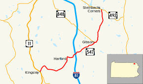 Pennsylvania Route 547 (PA 547) is an 11-mile-long (18 km) state highway located in Susquehanna County, Pennsylvania. The southern terminus is at U.S. Route 11 (US 11) in Harford Township. The northern terminus is at PA 492 in Jackson Township.