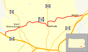 Pennsylvania Route 722 (PA 722) is an 8.8-mile-long (14.2 km), east–west state highway located in central Lancaster County, Pennsylvania. The western terminus is at an interchange with PA 283 in East Hempfield Township, where State Road continues westward toward Harrisburg Pike turning into Centerville Road upon crossing. The eastern terminus is at PA 272 in Oregon. PA 722 is a two-lane undivided road that passes through suburban areas to the north of Lancaster. The route intersects PA 72 in East Petersburg and forms a concurrency with PA 501 in Neffsville.