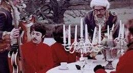 More filming was done in Knole Park in Sevenoaks,[72] where the clip for "Strawberry Fields Forever" had been filmed the week before.[67] Shot on 7 February, this footage includes further horse-riding scenes, with the band members dressed in matching red tunics, and the closing scene, when they arrive at a table set up in the park, bearing a large candelabra.[62][74] During the horse ride, they pass by a stage filled with their guitars and drum kit, the latter bearing the familiar Beatles logo.[75][76] The musicians sit at the table, where they are waited on by two attendants (played by Bramwell and Mal Evans)_"Penny_Lane_(promotional_film_clip/Subafilms)"-73">[68] dressed in Renaissance-era costumes and wigs,[77] and presented with their musical instruments.[74] According to music critic Chris Ingham, the film appears to be "little more than an extra-curricular afterthought" relative to the surreal and experimental "Strawberry Fields Forever" clip. He adds that it nevertheless closes with "another iconoclastic gesture" as Lennon overturns the table and scatters its contents.[78]