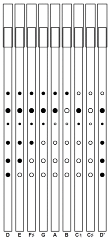 Fingering in the second register is generally the same as in the first/fundamental, though alternate fingerings are sometimes employed in the higher end of the registers to correct a flattening effect caused by higher aircolumn velocity.[27] Also, the tonic note of the second register is usually played with the top hole of the whistle partially uncovered instead of covering all holes as with the tonic note of the first register; this makes it harder to accidentally drop into the first register and helps to correct pitch. Recorders perform this by "pinching" open the dorsal thumb hole.