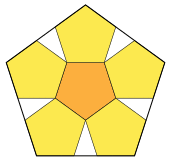 Penrose originally discovered the P1 tiling in this way, by decomposing a pentagon into six smaller pentagons (one half of a net of a dodecahedron) and five half-diamonds; he then observed that when he repeated this process the gaps between pentagons could all be filled by stars, diamonds, boats and other pentagons.[26] By iterating this process indefinitely he obtained one of the two P1 tilings with pentagonal symmetry.[9][19]