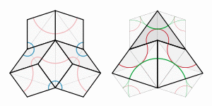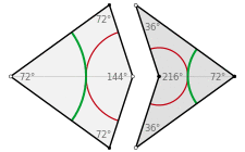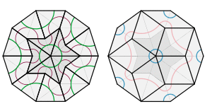 The matching rules can be described in several ways. One approach is to color the vertices (with two colors, e.g., black and white) and require that adjacent tiles have matching vertices.[30] Another is to use a pattern of circular arcs (as shown above left in green and red) to constrain the placement of tiles: when two tiles share an edge in a tiling, the patterns must match at these edges.[20]