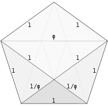 Several properties and common features of the Penrose tilings involve the golden ratio φ = (1+√5)/2 (approximately 1.618).[29][30] This is the ratio of chord lengths to side lengths in a regular pentagon, and satisfies φ = 1 + 1/φ.