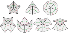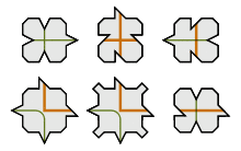 These rules often force the placement of certain tiles: for example, the concave vertex of any dart is necessarily filled by two kites. The corresponding figure (center of the top row in the lower image on the left) is called an "ace" by Conway; although it looks like an enlarged kite, it does not tile in the same way.[31] Similarly the concave vertex formed when two kites meet along a short edge is necessarily filled by two darts (bottom right). In fact, there are only seven possible ways for the tiles to meet at a vertex; two of these figures – namely, the "star" (top left) and the "sun" (top right) – have 5-fold dihedral symmetry (by rotations and reflections), while the remainder have a single axis of reflection (vertical in the image).[32] Apart from the ace and the sun, all of these vertex figures force the placement of additional tiles.[33]