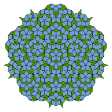 A Penrose tiling is an example of an aperiodic tiling. Here, a tiling is a covering of the plane by non-overlapping polygons or other shapes, and aperiodic means that shifting any tiling with these shapes by any finite distance, without rotation, cannot produce the same tiling. However, despite their lack of translational symmetry, Penrose tilings may have both reflection symmetry and fivefold rotational symmetry. Penrose tilings are named after mathematician and physicist Roger Penrose, who investigated them in the 1970s.