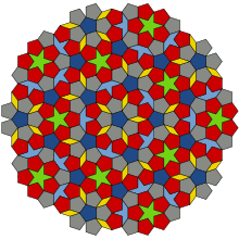 The first Penrose tiling (tiling P1 below) is an aperiodic set of six prototiles, introduced by Roger Penrose in a 1974 paper,[16] based on pentagons rather than squares. Any attempt to tile the plane with regular pentagons necessarily leaves gaps, but Johannes Kepler showed, in his 1619 work Harmonices Mundi, that these gaps can be filled using pentagrams (star polygons), decagons and related shapes.[17] Traces of these ideas can also be found in the work of Albrecht Dürer.[18] Acknowledging inspiration from Kepler, Penrose found matching rules for these shapes, obtaining an aperiodic set. These matching rules can be imposed by decorations of the edges, as with the Wang tiles. Penrose's tiling can be viewed as a completion of Kepler's finite Aa pattern.[19]