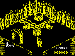 As with the previous two Filmation games, enemies may interact with scenery in a very basic way, shoving any movable objects (such as logs and tables) along when they bump into them. As before, Sabreman may also push one or more of these objects at once, though in Pentagram he may even move them from a distance with a blast of his magic.