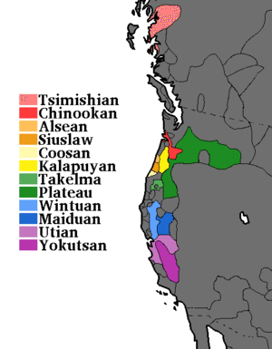 Some of the more recently proposed subgroupings of Penutian have been convincingly demonstrated. The Miwokan and the Costanoan languages have been grouped into an Utian language family by Catherine Callaghan.[2] Callaghan has more recently provided evidence supporting a grouping of Utian and Yokutsan into a Yok-Utian family.[3][4] There also seems to be convincing evidence for the Plateau Penutian grouping (originally named Shahapwailutan by J. N. B. Hewitt and John Wesley Powell in 1894) which would consist of Klamath–Modoc, Molala, and the Sahaptian languages (Nez Percé and Sahaptin).[5]