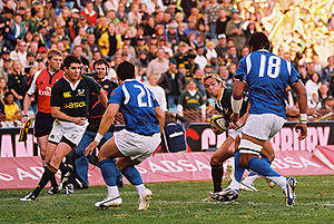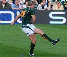 Percival Colin "Percy" Montgomery OIS (born 15 March 1974 in the South African enclave of Walvis Bay, now Namibia) is a retired South African rugby union player. When he ended his international career in August 2008, he held the all-time records for both caps and points for South Africa's national team, known as the Springboks.[1]