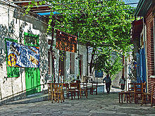 A pergola is an outdoor garden feature forming a shaded walkway, passageway, or sitting area of vertical posts or pillars that usually support cross-beams and a sturdy open lattice, often upon which woody vines are trained.[1] The origin of the word is the Late Latin pergula, referring to a projecting eave. As a type of gazebo, it may also be an extension of a building or serve as protection for an open terrace or a link between pavilions. They are different from green tunnels, with a green tunnel being a type of road under a canopy of trees.