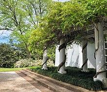 The origin of the word is the Late Latin pergula, referring to a projecting eave.[3] The English term was borrowed from Italian. It was mentioned in an Italian context in 1645 by John Evelyn at the cloister of Trinità dei Monti in Rome[4] He used the term in an English context in 1654 when, in the company of the fifth Earl of Pembroke, Evelyn watched the coursing of hares from a "pergola" built on the downs near Salisbury for that purpose.[5]