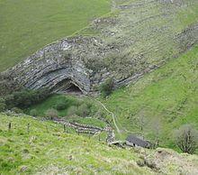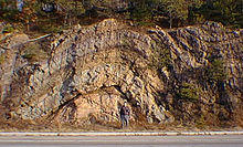 An overturned anticline is an asymmetrical anticline with a limb that has been tilted beyond perpendicular, so that the beds in that limb have basically flipped over and may dip in the same direction on both sides of the axial plane.[3] If the angle between the limbs is large (70–120 degrees), then the fold is an "open" fold, but if the angle between the limbs is small (30 degrees or less), then the fold is a "tight" fold.[4] If an anticline plunges (i.e., the anticline crest is inclined to the Earth's surface), it will form Vs on a geologic map view that point in the direction of plunge. A plunging anticline has a hinge that is not parallel to the earth's surface. All anticlines and synclines have some degree of plunge. Periclinal folds are a type of anticlines that have a well-defined, but curved hinge line and are doubly plunging and thus elongate domes.[5]