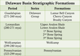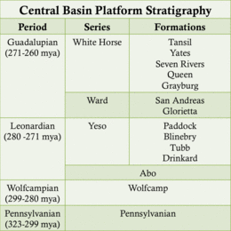 - ^ a b c d e f g h i j k Hill, Carol A. (1996). Geology of the Delaware Basin, Guadalupe, Apache, and Glass Mountains, New Mexico and West Texas. Permian Basin Section-SEPM. OCLC 994835616.