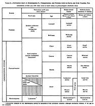 Each period from the Paleozoic Era has contributed a specific lithology to the Tobosa Basin, accumulating into almost 6,600 feet (2,000 m) of sediment at the start of the Pennsylvanian Period (323.2–298.9 mya).[7] The Montoya Group is the youngest rock formation in the Tobosa Basin and was formed in the Ordovician Period (485.4–443.8 mya), and sit directly on the igneous and metamorphic basement rocks. The rocks from the Montoya Group are described as light to medium grey, fine to medium grained crystalline calcareous dolomite. These rocks were sometimes inter-bedded with shale, dark grey limestone, and, less commonly, chert. the Montoya Group sequence is made up of carbonate limestone and dolomite which is described as dense, impermeable, and non-porous, and is more commonly found in the Glass Mountains outcrop, with thickness varying from 151 to 509 feet (46 to 155 m).[7]