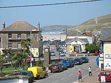 Perranporth (Cornish: Porthperan)[2] is a seaside resort town on the north coast of Cornwall, England, United Kingdom. It is 1 mile east of the St Agnes Heritage Coastline, and around 8 miles south-west of Newquay. Perranporth and its 3 miles (5 km) long beach face the Atlantic Ocean.[3] It has a population of 3,066,[4] and is the largest settlement in the civil parish of Perranzabuloe. It has an electoral ward in its own name, whose population was 4,270 in the 2011 census.[5]