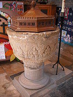In about 1840 the abbey was given a new baptismal font and the original Norman font was cast out into the churchyard. It was later used as a cattle trough, and later used in a garden at nearby Kempsey. In 1912 a war memorial was erected on the site of the Victorian font and the old font was returned, on a pedestal designed by Harold Brakspear. The font is decorated with an interlacing arcade, in the panels of which are the figures of Christ and his Apostles.[39]