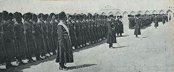 The Persian Cossack Brigade or Iranian Cossack Brigade[2] (Persian: بریگاد قزاق, romanized: Berīgād-e qazzāq) was a Cossack-style cavalry unit formed in 1879 in Persia (modern Iran). It was modelled after the Caucasian Cossack regiments of the Imperial Russian Army. Until 1920, it was commanded by Russian officers, while its rank and file were composed of ethnic Caucasians and later on Persians as well. During much of the Brigade's history it was the most functional and effective military unit of the Qajar Dynasty. Acting on occasion as kingmakers, this force played a pivotal role in modern Iranian history during the Revolution of 1905–1911, the rise of Reza Shah, and the foundation of the Pahlavi Dynasty.