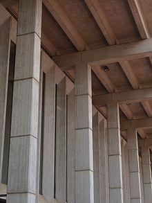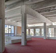 The Perth Concert Hall is an example of brutalist architecture, with its solid opaque interior, giant projecting roof, and use of white off-form concrete. It forms a counterpoint to the transparent filigree of Council House.[6]