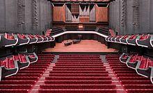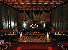 The auditorium features a specially commissioned 3000-pipe organ surrounded by a 160-person choir gallery and an audience seating capacity of 1,729.[7] The organ, individually designed, cost $100,000 and was commissioned by Ronald Sharp of Sydney, who was also responsible for the organ at the Sydney Opera House. The larger pipes for the organ were imported from the Netherlands. Don Bailey recollects that Ron Sharp was an 'extraordinarily talented person, largely self-educated, who has to his credit the design and construction of a number of organs, mostly in New South Wales. A nine-foot Steinway orchestral concert grand piano (Model D) was also imported from West Germany for installation in the Hall.