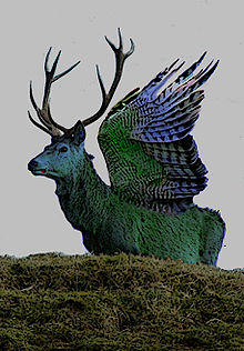 The peryton is said to have the head, neck, forelegs and antlers of a stag, combined with the plumage, wings and hindquarters of a large bird, although some interpretations portray the peryton as a deer in all but coloration and bird's wings.