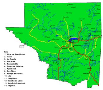 The Petén department is bordered on the east by Belize and by Mexico (with the Mexican states of Chiapas to the west, Tabasco to the northwest and Campeche to the north).[3] To the south it borders the Guatemalan departments of Alta Verapaz and Izabal.[4] Much of the western border with Mexico is formed by the Usumacinta River and its tributary the Salinas River.[4] Portions of the southern border of the department are formed by the rivers Gracias a Dios and Santa Isabel.[4]