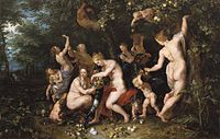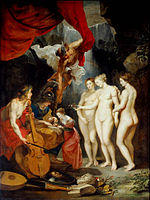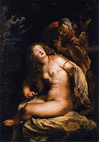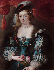 His nudes of various biblical and mythological women are especially well-known. Painted in the Baroque tradition of depicting women as soft-bodied, passive, and highly sexualized beings, his nudes emphasize the concepts of fertility, desire, physical beauty, temptation, and virtue. Skillfully rendered, these paintings of nude women were undoubtedly created to appeal to his largely male audience of patrons.[30] Additionally, Rubens was quite fond of painting full-figured women, giving rise to terms like 'Rubensian' or 'Rubenesque' (sometimes 'Rubensesque'). And while the male gaze features heavily in Rubens's paintings of females generally, he brings multi-layered allegory and symbolism to his portraits.[31] His large-scale cycle representing Marie de Medicis focuses on several classic female archetypes like the virgin, consort, wife, widow, and diplomatic regent.[32] The inclusion of this iconography in his female portraits, along with his art depicting noblewomen of the day, serve to elevate his female portrait sitters to the status and importance of his male portrait sitters.[32]