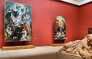 Rubens later made a copy of Caravaggio's Entombment of Christ and recommended his patron, the Duke of Mantua, to purchase The Death of the Virgin (Louvre).[10] After his return to Antwerp he was instrumental in the acquisition of The Madonna of the Rosary (Kunsthistorisches Museum, Vienna) for the St. Paul's Church in Antwerp.[11] During this first stay in Rome, Rubens completed his first altarpiece commission, St. Helena with the True Cross for the Roman church of Santa Croce in Gerusalemme.