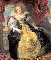 In 1621, the Queen Mother of France, Marie de' Medici, commissioned Rubens to paint two large allegorical cycles celebrating her life and the life of her late husband, Henry IV, for the Luxembourg Palace in Paris. The Marie de' Medici cycle (now in the Louvre) was installed in 1625, and although he began work on the second series it was never completed.[20] Marie was exiled from France in 1630 by her son, Louis XIII, and died in 1642 in the same house in Cologne where Rubens had lived as a child.[21]