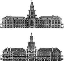 The Kunstkamera was established by Peter the Great on the Neva Riverfront. The turreted Petrine Baroque building of the Kunstkamera designed by Prussian architect Georg Johann Mattarnovy was completed in 1727. The foundation stone was laid in 1719. The name Kunstkamera is derived from German Kunstkammer, literally meaning "Art chamber".