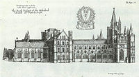 In the mid-10th century monastic revival (in which churches at Ely and Ramsey were also refounded) a Benedictine Abbey was created and endowed in 966, principally by Athelwold, Bishop of Winchester, from what remained of the earlier church, with "a basilica [church] there furbished with suitable structures of halls, and enriched with surrounding lands" and more extensive buildings which saw the aisle built out to the west with a second tower added. The original central tower was, however, retained.[4] It was dedicated to St Peter and surrounded by a palisade, called a burgh, hence the town surrounding the abbey was eventually named Peter-burgh. The community was further revived in 972 by Dunstan, Archbishop of Canterbury.[2][5]
