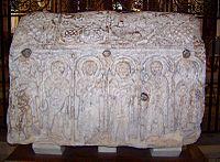 The original church, known as "Medeshamstede", was founded in the reign of the Anglo-Saxon King Peada of the Middle Angles in about 655 AD, as one of the first centres of Christianity in central England.[2] The monastic settlement with which the church was associated lasted at least until 870, when it was supposedly destroyed by Vikings. In an alcove of the New Building, an extension of the eastern end, lies an ancient stone carving: the Hedda Stone. This medieval carving of 12 monks, six on each side, commemorates the destruction of the Monastery and the death of the Abbot and Monks when the area was sacked by the Vikings in 864. The Hedda Stone was likely carved sometime after the raid, when the monastery slipped into decline.[3]