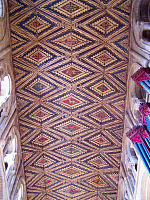 Although damaged during the struggle between the Norman invaders and local folk-hero, Hereward the Wake, it was repaired and continued to thrive until destroyed by an accidental fire in 1116.[7] This event necessitated the building of a new church in the Norman style, begun by Abbot John de Sais on 8 March 1118 (Old Style).[2] By 1193, the building was completed to the western end of the Nave, including the central tower and the decorated wooden ceiling of the nave. The ceiling, completed between 1230 and 1250, still survives. It is unique in Britain and one of only four such ceilings in the whole of Europe.[8] It has been over-painted twice, once in 1745, then in 1834, but still retains the character and style of the original. (The painted nave ceiling of Ely Cathedral, by contrast, is entirely a Victorian creation.)