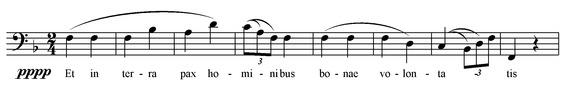 = 120), the first line is introduced by two sequences of three chordal motifs, separated by a measure of silence. According to Claire Delamarche, these represent the trois coups announcing the rise of the curtain in the French theater tradition.[13] The sopranos alone sing the first line, "Glory to God in the Highest", repeated by a four-part harmonization.[26]
