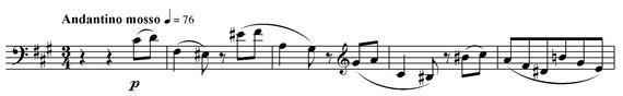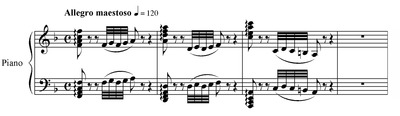 = 92), is written for piano and asks for dynamics ranging from double forte to double piano una corda. It announces at the same time the F♯ tonality, and the modulating character of the movement, by chords borrowed from distant keys. The solemn rhythmic style (