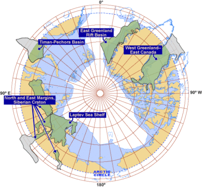 More than 70% of the mean undiscovered oil resources is estimated to occur in five provinces: Arctic Alaska, Amerasia Basin, East Greenland Rift Basins, East Barents Basins, and West Greenland–East Canada. It is further estimated that approximately 84% of the undiscovered oil and gas occurs offshore. The USGS did not consider economic factors such as the effects of permanent sea ice or oceanic water depth in its assessment of undiscovered oil and gas resources. This assessment is lower than a 2000 survey, which had included lands south of the arctic circle.[3][4][5]