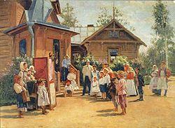 Petrushka begins with a festive orchestral introduction based, in part, on historical Russian street-hawkers' cries.[9] The curtain rises to reveal St. Petersburg's Admiralty Square during the 1830s. The stage set (also by Benois) depicts several hucksters' booths, a ferris-wheel, a carousel, and (upstage center) a puppet theater. A crowd has gathered for the Shrovetide Fair (known as Maslenitsa), the carnival (analogous to Mardi Gras) preceding Lent.