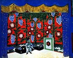 As before, drumrolls link the Third Tableau to its predecessor (in the 1911 score, Stravinsky directs that this drumroll should be omitted in concert performance). In sharp contrast to the darkness of Petrushka's Room, the brilliant colors of the Benois design for the Moor's Room evoke a romanticized desert: palm trees, exotic flowers, sand.
