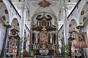 In 1665 a fire destroyed the medieval monastery and church.[2] In 1672, Abbot Justus Zink presented plans by John Serro and Giuglio Barbieri for rebuilding the abbey, in the Baroque style, closer to the mountain slope, in the present dominant position, with the first rooms ready for occupation in 1674. Because of the disastrous financial situation, Abbot Zink was forced to resign in 1676, passing control to the Swiss Congregation of the Benedictine Confederation. His successor, Abbot Boniface I Tschupp, managed the financial recovery and completed the construction in 1694, with the new abbey church dedicated in the same year.