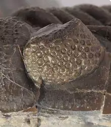Like in all Phacopina, the eyes (if present) consist of very large (0.5mm in Phacops rana), separately set lenses without a common cornea (so called schizochroal eyes). However, several phacopids have very few lenses, such as the species of the genera Cryphops, Denckmannites, Dienstina, Eucryphops, Nephranops, and Plagiolaria, or lack eyes altogether, like Afrops, Dianops, Ductina, and Trimerocephalus. The natural fracture lines (sutures) of the head run along the top edges of the compound eye. From the back of the eye these cut to the side of the head (proparian) and not to the back. In front of the eye, the right and left facial sutures connect in front of the inflated glabella and consequently the free cheeks (or librigenae) are yoked as a single piece. In some of the eyeless genera (Ductina) the suture coincides with the marginal suture, and thus appears to be absent. The part of the skeleton that is "tucked under" (the doublure) has no sutures crossing it to form a rostral plate. The thorax has 11 (rarely 10) segments, the side lobes (or pleurae) are furrowed, and the articulating facets distinct. The tailshield (or pygidium) is always smaller than the headshield (or cephalon), a situation called micropygous.
