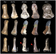 - ^ a b c d Almécija, Sergio; Moyà-Solà, Salvador; Alba, David M.; Strait, David S. (22 July 2010). "Early Origin for Human-Like Precision Grasping: A Comparative Study of Pollical Distal Phalanges in Fossil Hominins". PLoS ONE. 5 (7): e11727. doi:10.1371/journal.pone.0011727. PMC 2908684. PMID 20661444.