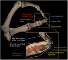 In the hand, the distal phalanges are flat on their palmar surface, small, and with a roughened, elevated surface of horseshoe form on the palmar surface, supporting the finger pulp.[3]:6b. 3. The Phalanges of the Hand The flat, wide expansions found at the tips of the distal phalanges are called apical tufts. They support the fingertip pads and nails.[4] The phalanx of the thumb has a pronounced insertion for the flexor pollicis longus (asymmetric towards the radial side), an ungual fossa, and a pair of unequal ungual spines (the ulnar being more prominent). This asymmetry is necessary to ensure that the thumb pulp is always facing the pulps of the other digits, an osteological configuration which provides the maximum contact surface with held objects.[5]