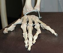 The phalanges are the bones that make up the fingers of the hand and the toes of the foot. There are 56 phalanges in the human body, with fourteen on each hand and foot. Three phalanges are present on each finger and toe, with the exception of the thumb and large toe, which possess only two. The middle and far phalanges of the fourth and fifth toes are often fused together (symphalangism).[1] The phalanges of the hand are commonly known as the finger bones. The phalanges of the foot differ from the hand in that they are often shorter and more compressed, especially in the proximal phalanges, those closest to the torso.