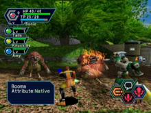 After organizing a team, players are transported to their own instance of the hub spaceship Pioneer 2, where they can buy and sell items, store money and items, heal, and browse quests.[11] At any time, they can transport to Ragol, where combat and exploration take place.[11] The four environments – forests, caves, mines, or ruins[11] – comprise winding passages and large areas where enemies spawn.[11] Players fight enemies in real time, using weapons and techniques and collecting items.[14] Attacks can be chained for more accuracy and speed.[15][16] Typically, all the monsters in a room must be defeated to advance.[10] Each environment ends in a boss battle, which rewards the team with a large sum of experience points.[11] Quests, taken on Pioneer 2, task players with specific challenges; once completed, the team returns to Pioneer 2 to collect their reward.[11] Higher difficulties reward players with more experience points and better items. Some items can be used to feed the player's mag, a small creature that follows the player character and aids them in battle.[11]