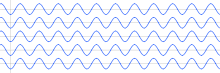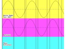 A phase comparison can be made by connecting two signals to a two-channel oscilloscope. The oscilloscope will display two sine signals, as shown in the graphic to the right. In the adjacent image, the top sine signal is the test frequency, and the bottom sine signal represents a signal from the reference.