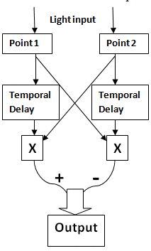 For phi phenomenon, motion detector would develop to detect a change in light intensities at one point on the retina, then our visual system would compute a correlation of that change with a change in light intensities of a neighboring point on the retina, with a short delay.[17]