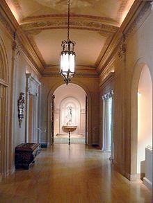 The interior of the mansion featured 72 rooms decorated with travertine and marble fireplaces and fountains, floors of teak, walnut and oak and ornate ceilings reminiscent of Italian villas. The main rooms of the house were found on the ground floor. The mansion is centered by the entrance hall, framed by a double staircase, that flows directly into the receiving hall. The hall is separated by a slightly raised cross-corridor with a groin vaulted ceiling painted with Italian Renaissance designs, further defined by twisted Corinthian columns and ironwork. The main features of the receiving hall are the beams and pierced screenwork that appear to be wood, but are actually painted plaster. Also, a two-manual Aeolian pipe organ can be found behind a large tapestry. Flanking the entrance and receiving halls and accessed by the cross-corridor are the dining room and library to the left and the living and music rooms to the right. The dining and living rooms feature heavily carved coffered ceilings, and the wood paneled library is centered by a globe light fixture that reproduces a map from the time of Leonardo da Vinci. The airy music room is highlighted by a wall mural with bobbed-hair flappers in Grecian garb that illustrates four musical tempos: scherzo, andante, rondo and allegro.[8]