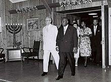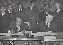 On 24 July 1959, Charles de Gaulle appointed four responsible African politicians, of whom Tsiranana was one, to the position of "Minister-Counsellor" of the French government for the affairs of the French Community.[39] Tsiranana used his new powers to call for national sovereignty for Madagascar; de Gaulle accepted this.[40] In February 1960, a Malagasy delegation led by André Resampa[41] was sent to Paris to negotiate the transfer of power.[42] Tsiranana insisted that all Malagasy organisations should be represented in this delegation, except for AKFM (which he deplored).[43] On 2 April 1960, the Franco-Malagasy accords were signed by Prime Minister Michel Debré and President Tsiranana at the Hôtel Matignon.[44] On 14 June, the Malagasy parliament unanimously accepted the accords.[45] On 26 June, Madagascar became independent.