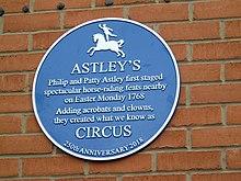 Astley and his wife put on the first circus show on Easter Monday, 4 April 1768.[6] Extending the equestrian performance with exhibitions of warlike sabre-work and sword-play. The initial performances were done in the open air at Ha'penny (= Halfpenny) Hatch, a field in Lambeth, London, near the present site of Waterloo railway station. The Astleys also performed at other locations in London. Astley performed his stunts in a circular arena, though Astley never used the title of 'circus' for his shows. Astley's 'Ride' (he also called it 'the Circle') was a ring 65 ft (19 metres) in diameter. Later, the size evolved to become standardised at 42 feet (13 metres) which is the size used by circuses ever since.[2] Leasing more permanent premises at Westminster Bridge from 1769, he improved conditions for audiences with a covered stands. The performances themselves, however, were still performed in the open. In 1770 he hired acrobats, tightrope walkers, jugglers and a clown to fill in the pauses between acts.[2] and so initiated the format which we now know as a 'circus' and which has since spread to many countries.